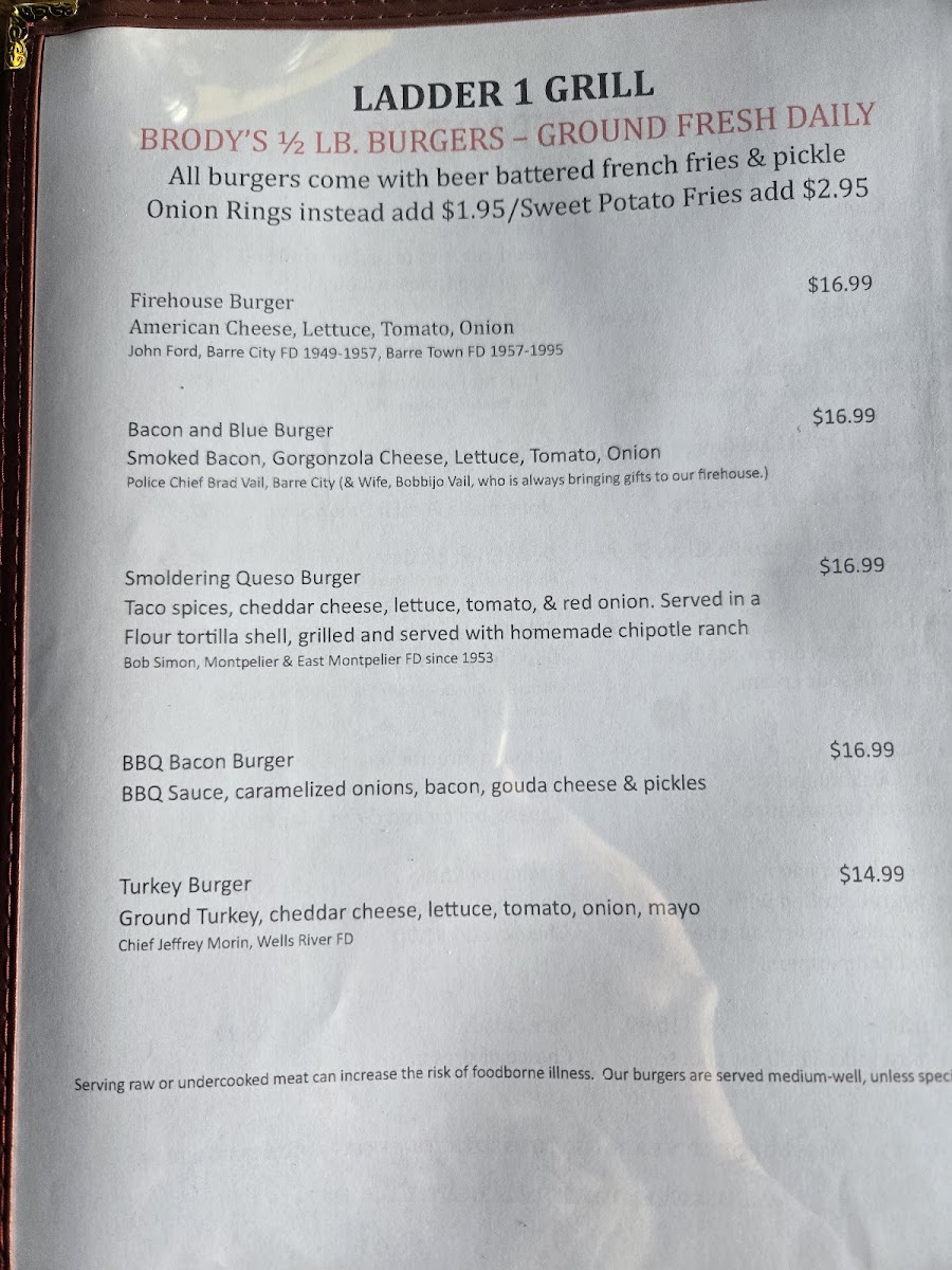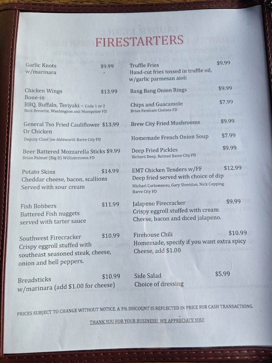 Overall, the menu matches the restaurant’s unique setting, inviting diners to enjoy familiar American classics with subtle surprises, all served in a space that reflects the history and charm of its firehouse roots.