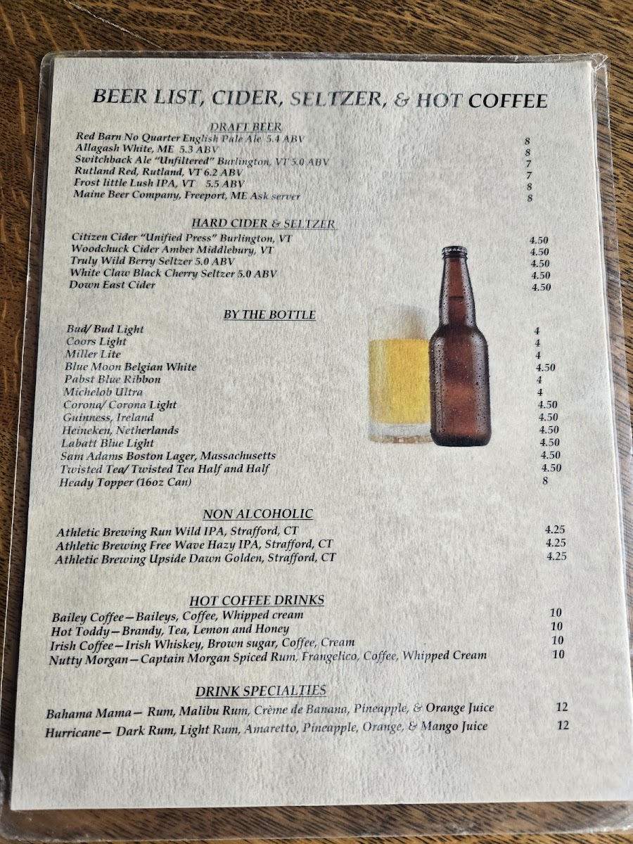 On the beverage side, the selection includes local hard ciders and refreshing seltzers, alongside thoughtfully chosen non-alcoholic craft beers. Iced tea and root beer fit perfectly with the casual, approachable feel of the meal, complementing both the bold and classic flavors on offer.